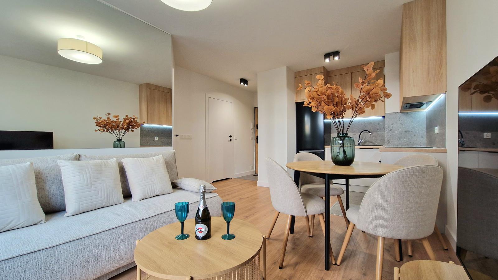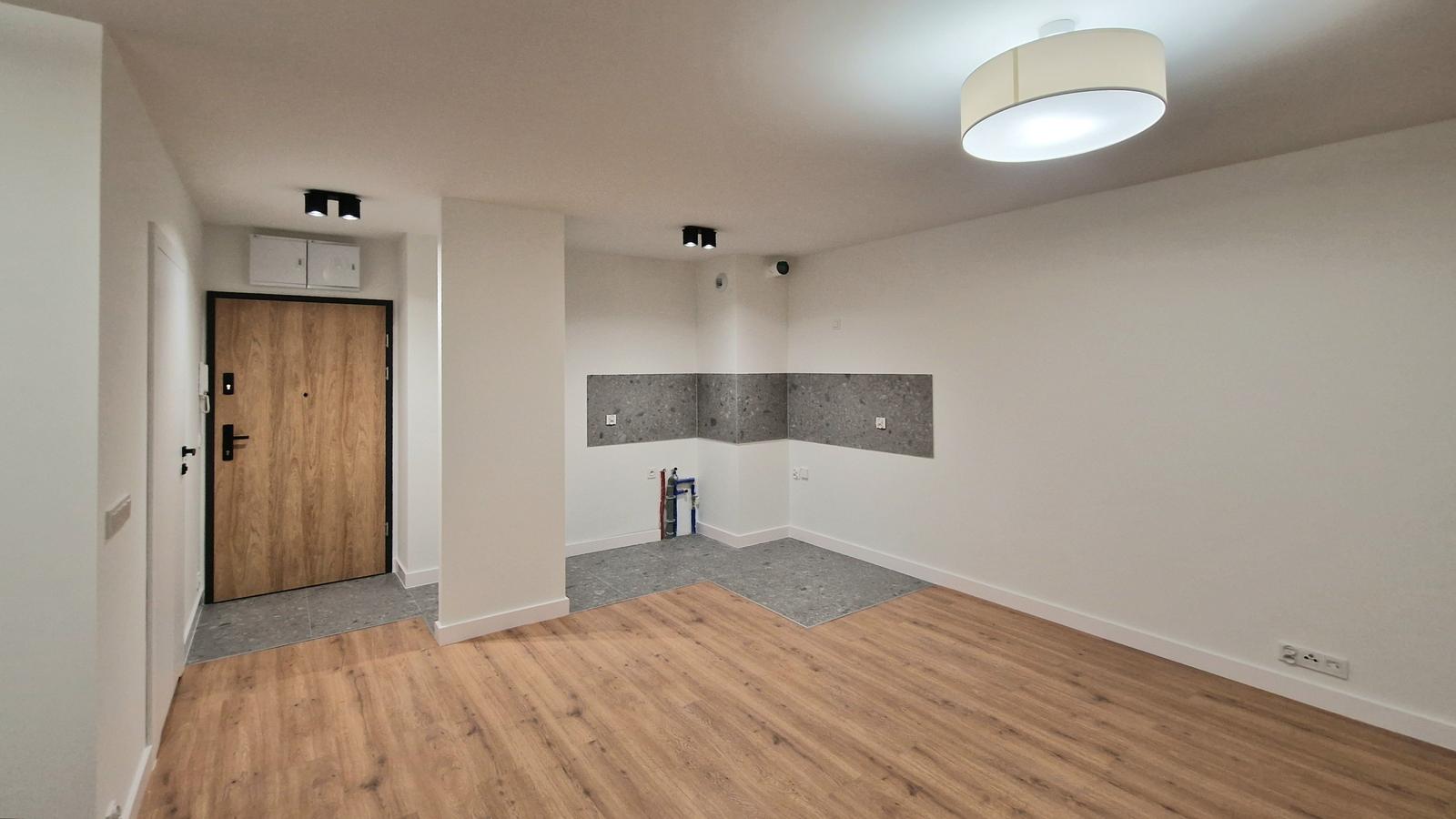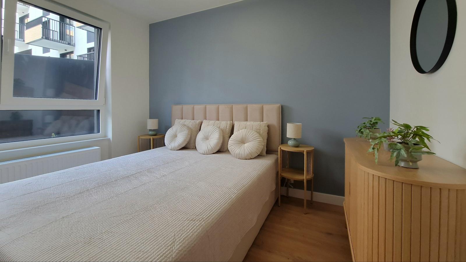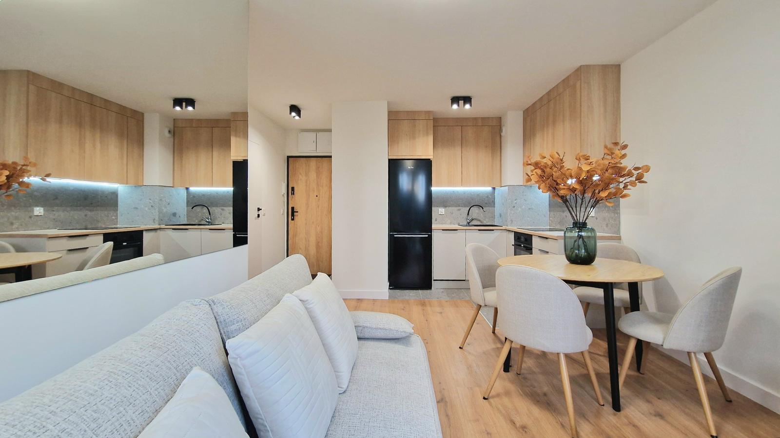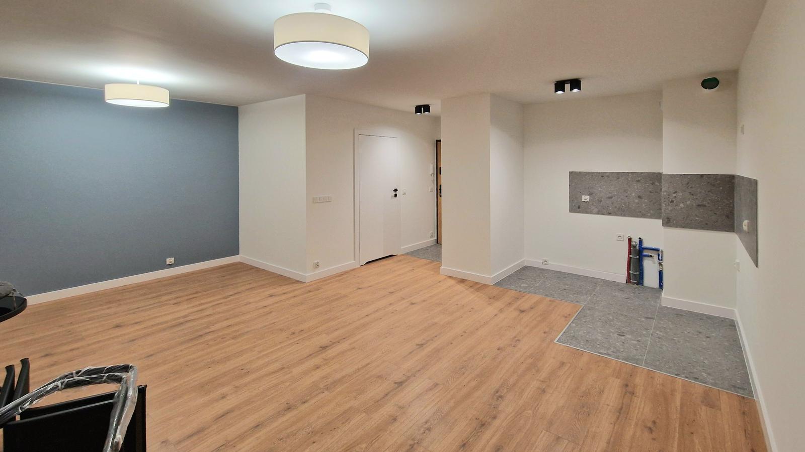To mieszkanie było kawalerką o powierzchni 32,5 m2. Na zlecenie Klienta zaprojektowaliśmy i wykonaliśmy 2 pokoje, tj. salon z aneksem kuchennym oraz odrębną sypialnię. W celu optycznego powiększenia salonu na ścianie zostało zamontowane lustro o powierzchni 2400 mm x 1600 mm.