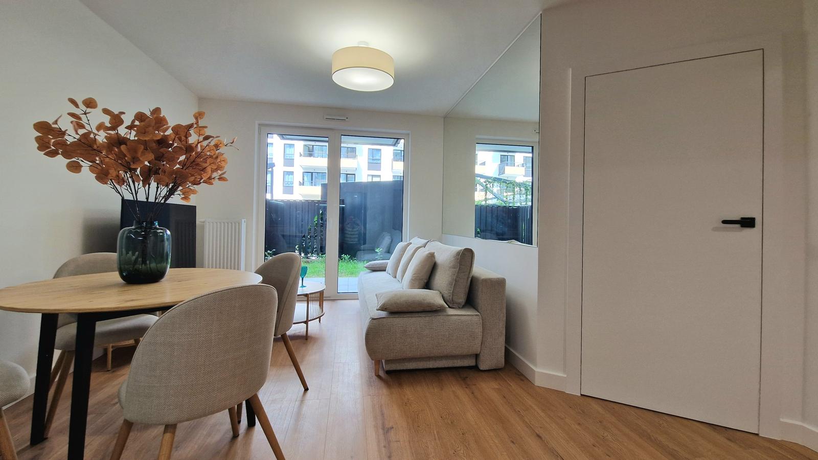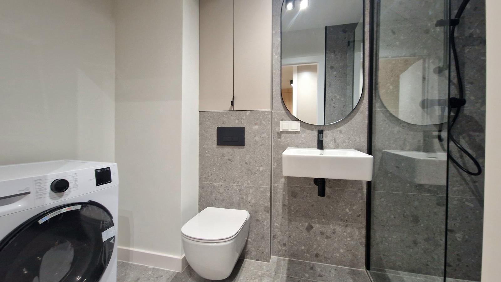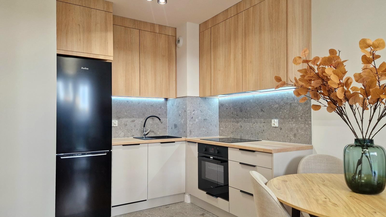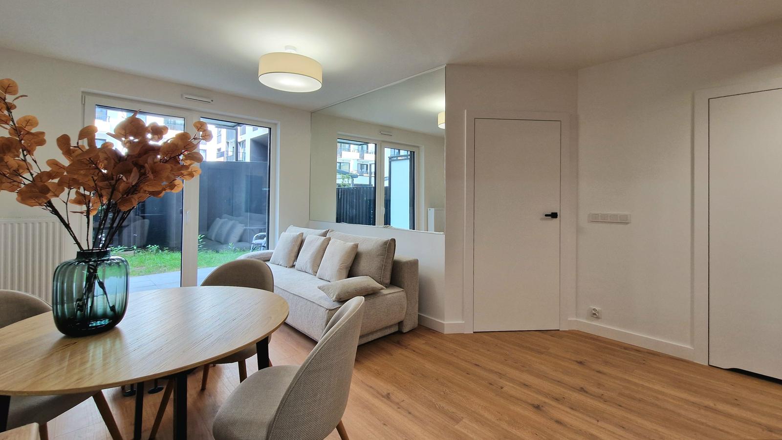 To mieszkanie było kawalerką o powierzchni 32,5 m2. Na zlecenie Klienta zaprojektowaliśmy i wykonaliśmy 2 pokoje, tj. salon z aneksem kuchennym oraz odrębną sypialnię. W celu optycznego powiększenia salonu na ścianie zostało zamontowane lustro o powierzchni 2400 mm x 1600 mm.