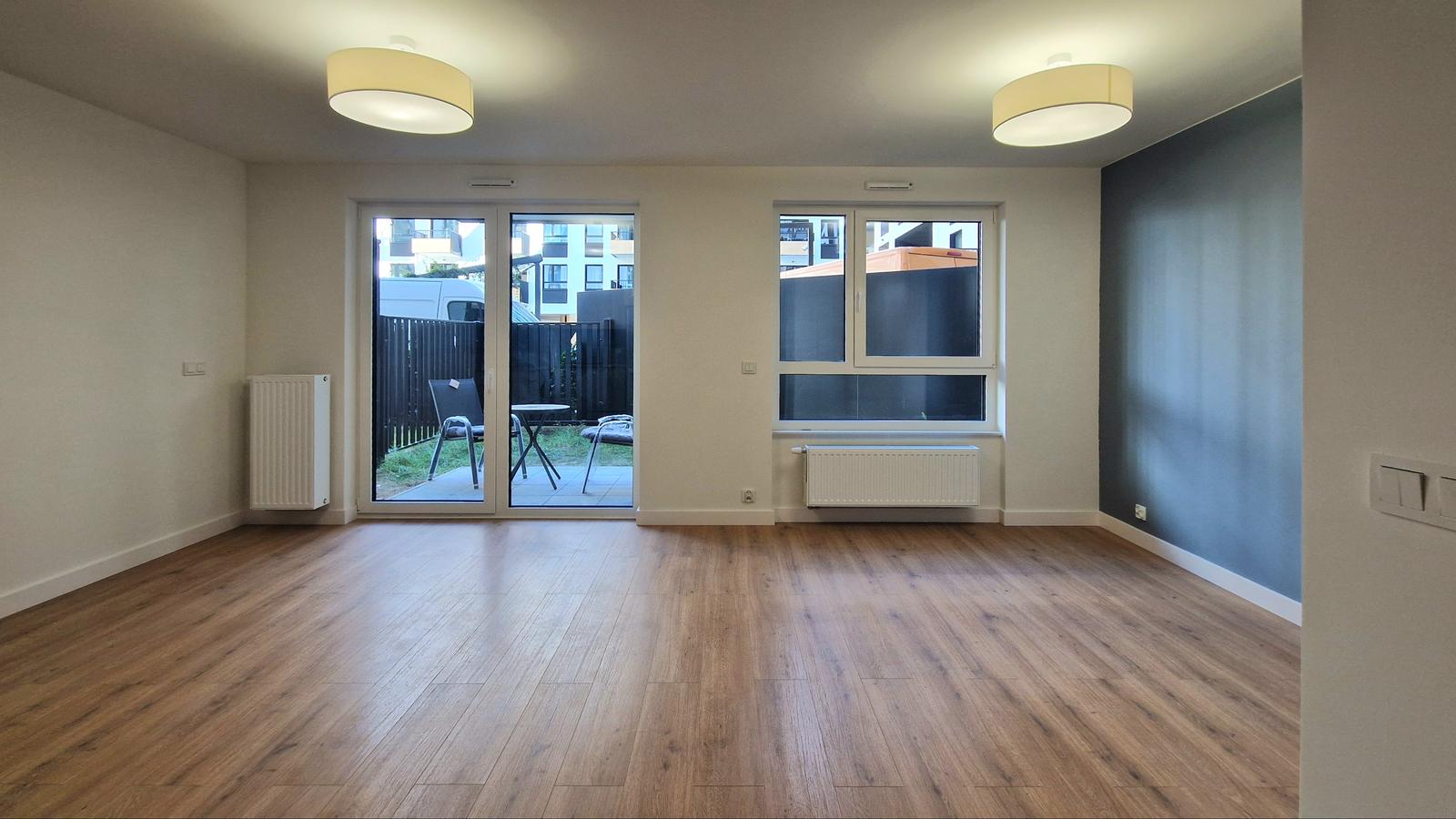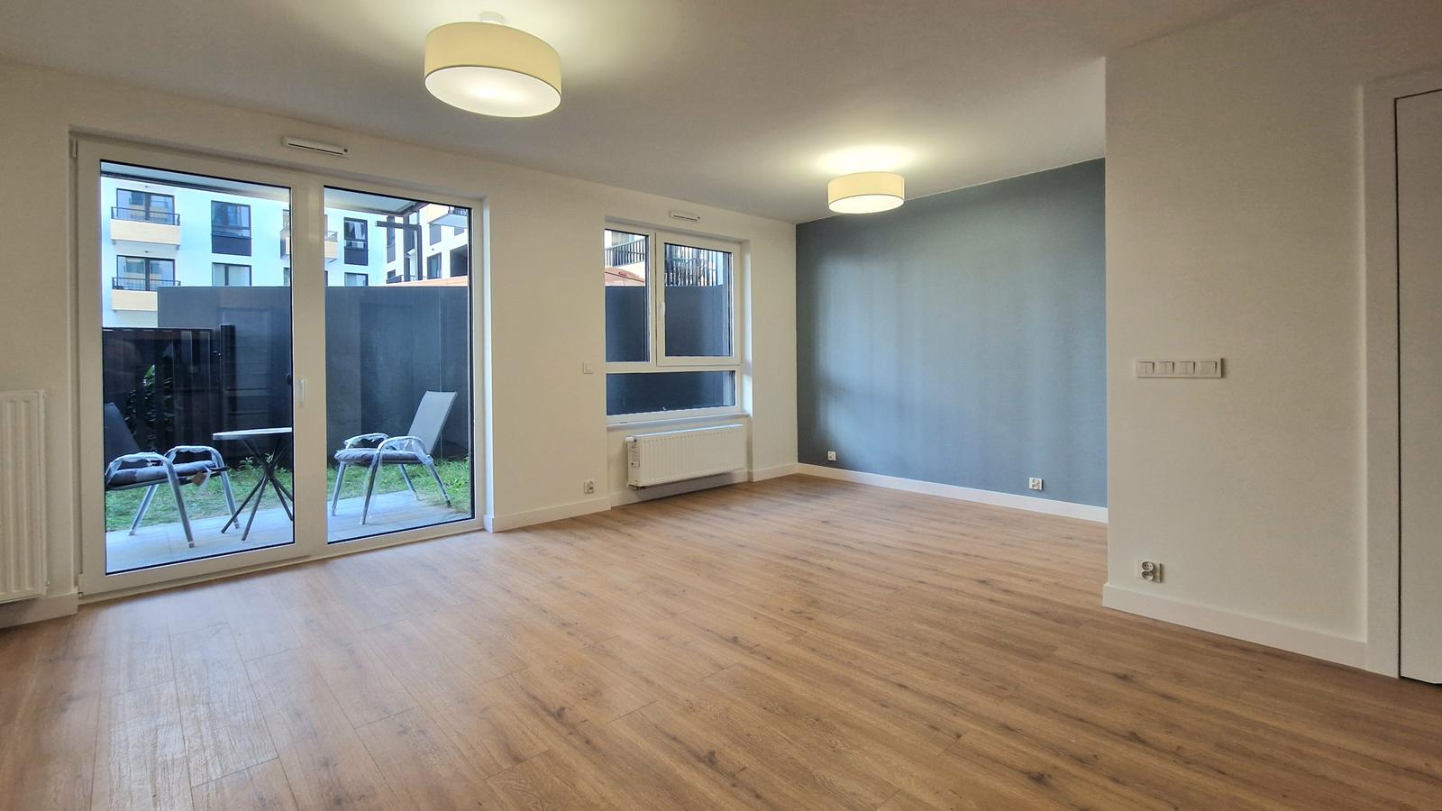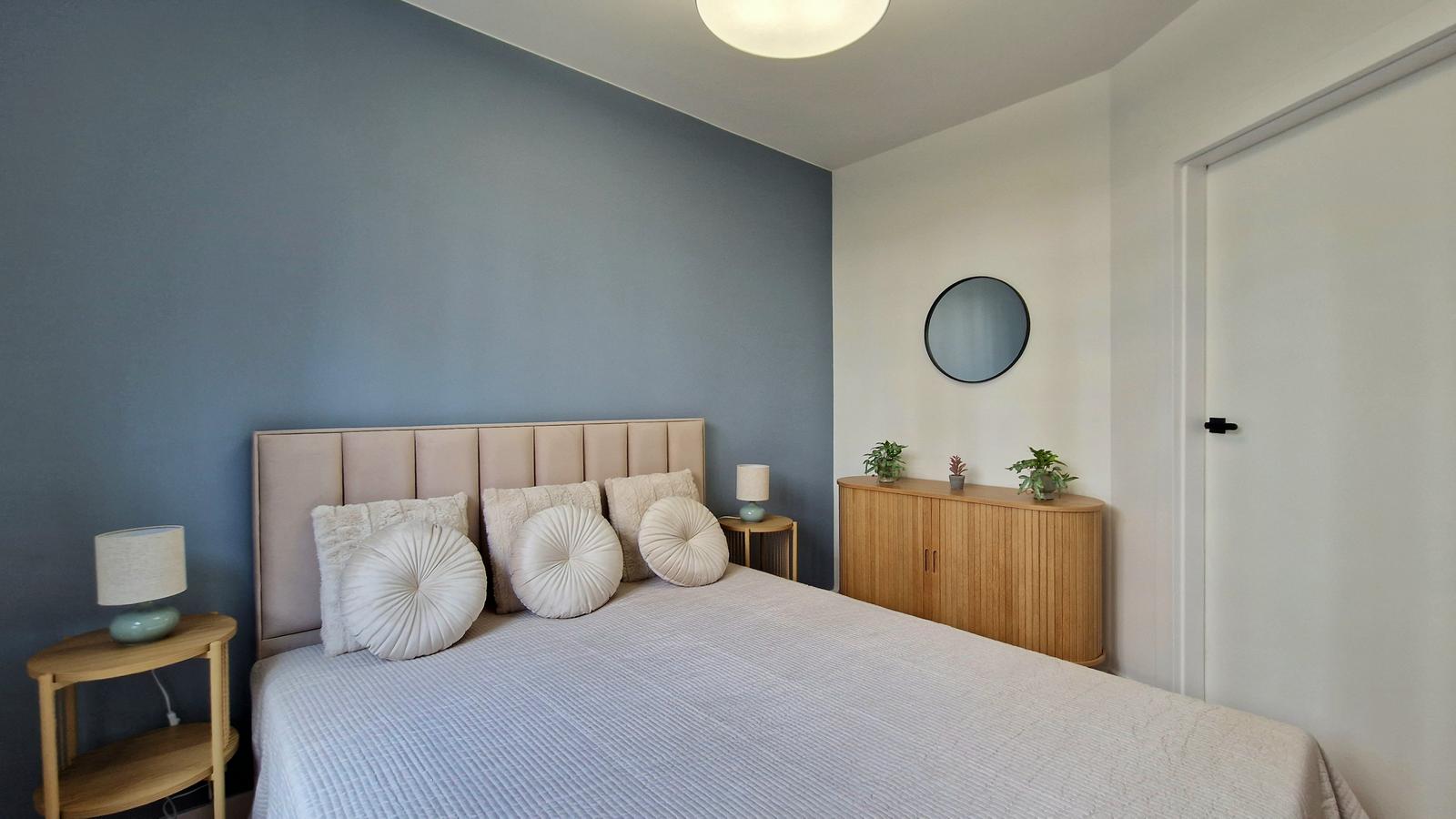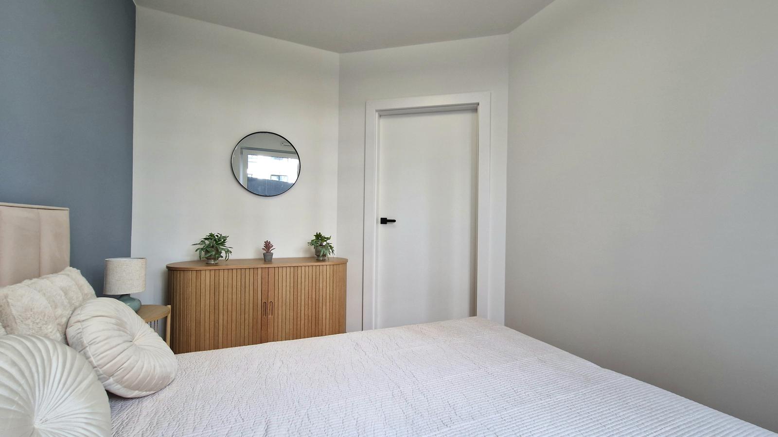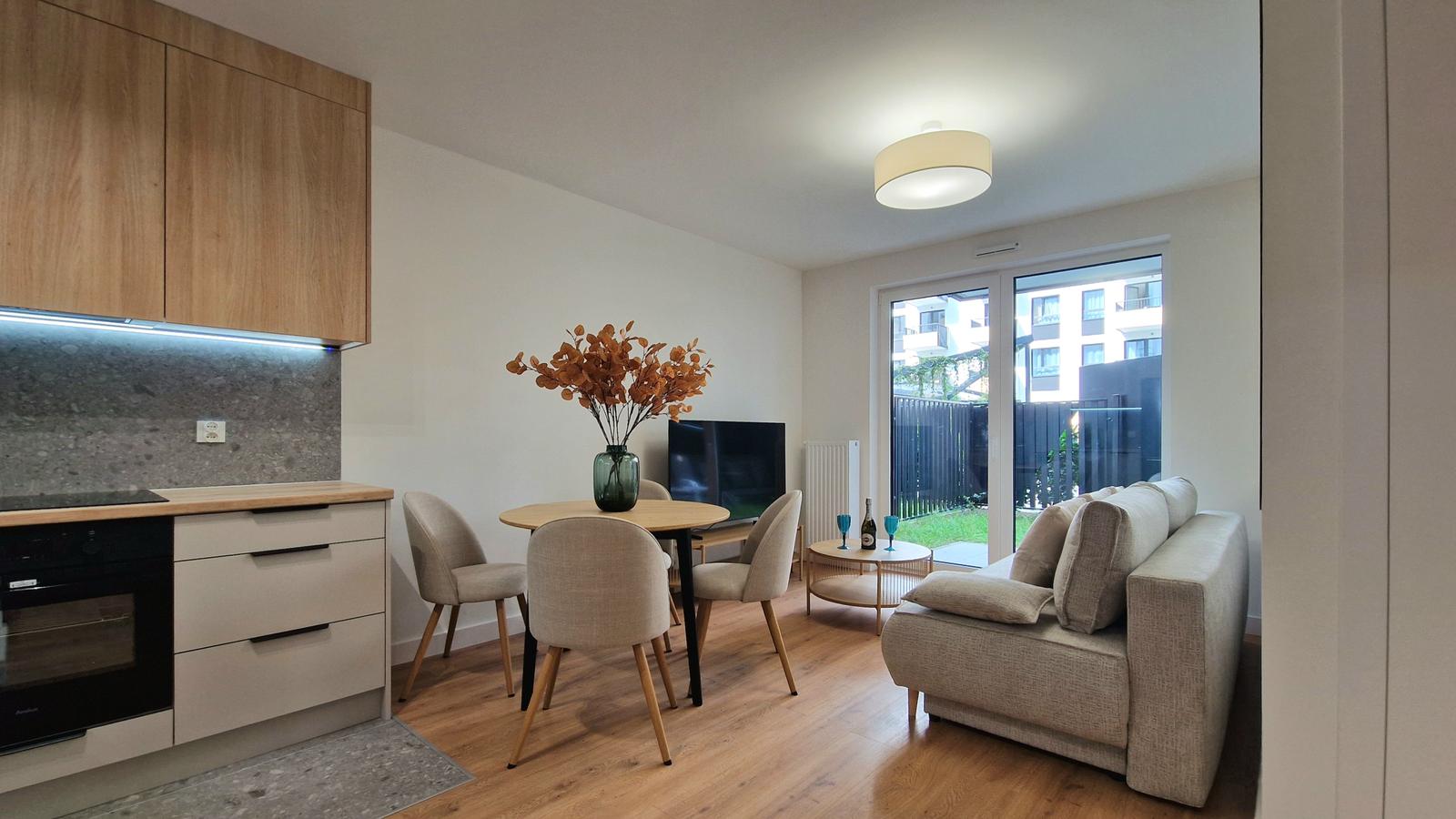 To mieszkanie było kawalerką o powierzchni 32,5 m2. Na zlecenie Klienta zaprojektowaliśmy i wykonaliśmy 2 pokoje, tj. salon z aneksem kuchennym oraz odrębną sypialnię. W celu optycznego powiększenia salonu na ścianie zostało zamontowane lustro o powierzchni 2400 mm x 1600 mm.