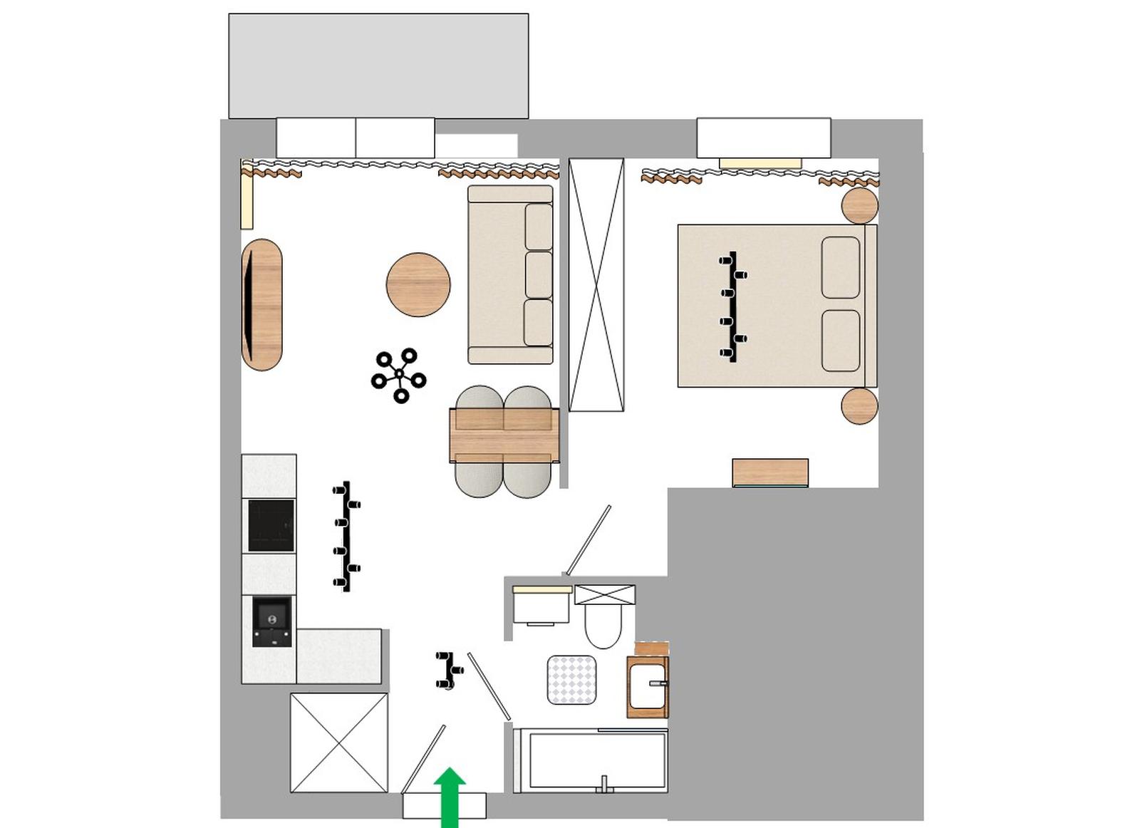 ➡️ Pokój dzienny z aneksem kuchennym: 18,5 m2, sypialnia 13,2 m2, łazienka 3,7 m2, przedpokój 3,4 m2, balkon/loggia 3,9 m2